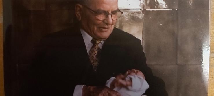 Ukki Unto Sorjonen (1920 - 2002) ja kirkuva keskosvauva Maria s. 1999 ristiäispäivänä Kuopiossa Linnanpellonkadun kodissamme.